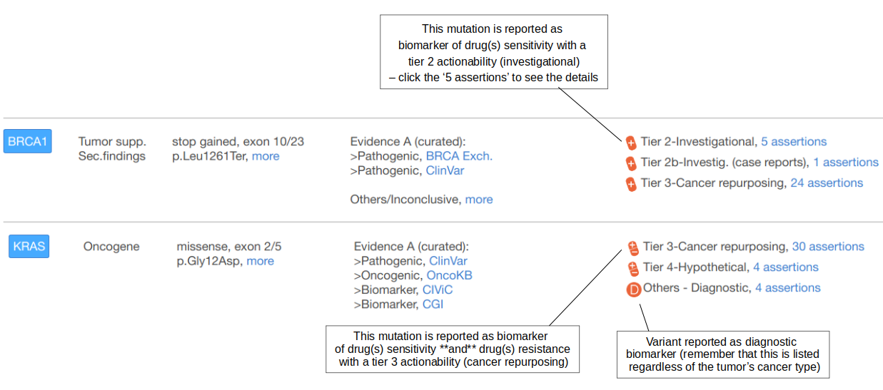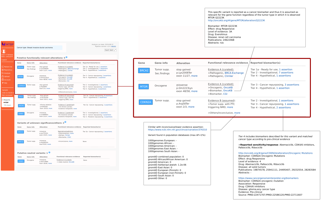 On the other hand, information about the predictive relevance (cancer prognosis, diagnostic and/or drug response) of the variant is now included in a new column named ‘Reported biomarker(s)’. In the public version of the MTBP, this analysis is solely based on the biomarkers reported by several public knowledgebases (CIViC, OncoKB and CancerGenomeInterpreter), which are updated in the portal on a regular basis (but not accessed in real time). Please note that this information is automatically aggregated by the annotation pipeline, as opposed to the MTBP instances employed by clinical projects such as Cancer Core Europe, in which the main actionability flags are manually curated based on in-house criteria. The public MTBP report provides a summary of the available information and the access to the corresponding knowledgebase entry for each given assertion via interactive popups (see image below).