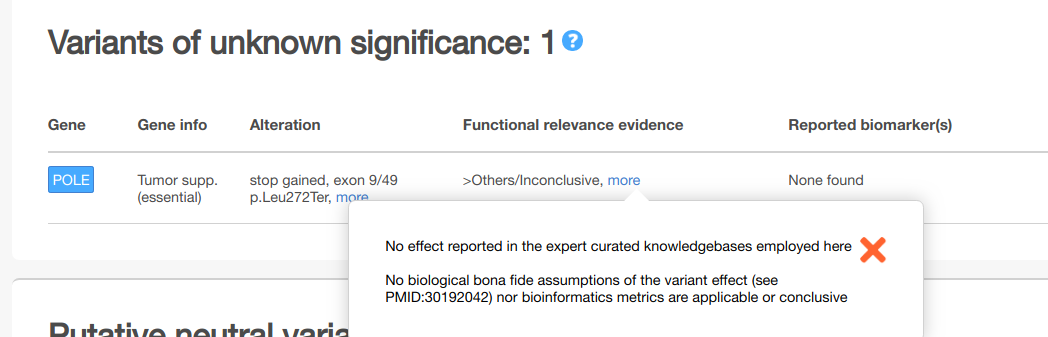 As a result, MTBP reports in the public portal will only classify as functionally relevant those specific POLE/POLD1 mutations known to interfere with their proofreading activity (and associated with an extensive increase in tumor mutation burden) without leading to a catastrophic event. Other variants (such as those of null consequence type likely leading to the complete loss-of-function of the encoded allele) will appear as of unknown functional relevance if no reported effect stating otherwise is available (see example below).