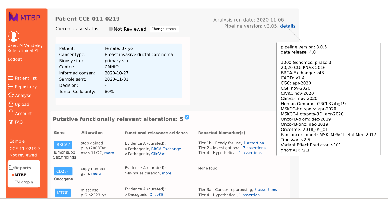 Please remember that the public website of the MTBP provided via https://www.mtbp.org/ gives only access to a lightweight version of the analytical pipeline, with limited features as compared to the system used for clinical projects, and thus the use of this public version must be limited to research purposes only (see disclaimer).