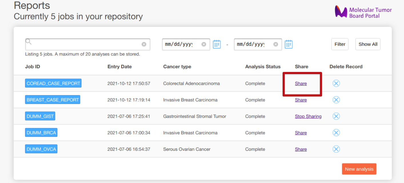 below) to make the link of the corresponding report publicly accessible. Click the 'Stop Sharing' to make the report private again.