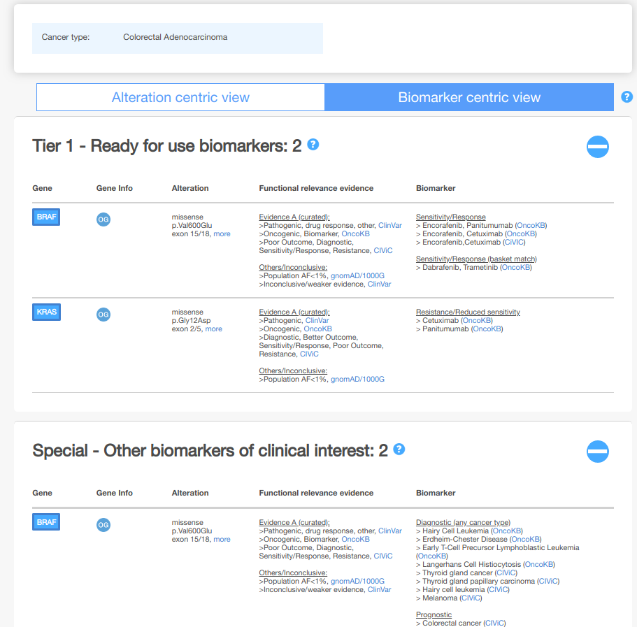 In addition, the user can now select a second view, the so-called biomarker-centric view (see image below). This report groups the gene alterations in different tables according to the actionability tier of their associated biomarkers (if any). Therefore, a given alteration can appear in more than one table if that alteration is associated with different actionability tiers. Of note, remember that the public version of the MTBP only shows biomarkers (prognosis, diagnosis and drug response) gathered by external knowledgebases (such as OncoKB or CIViC), and other clinical flags (such as variants matching with clinical trial opportunities) are not provided here.